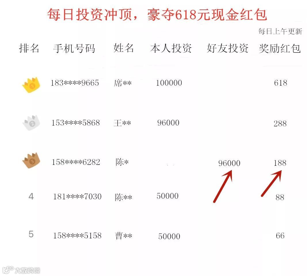 平台对每日投资者及其邀请的好友的投资金额之和进行实时排名,每日综合排名前5名将获得现金红包奖励。