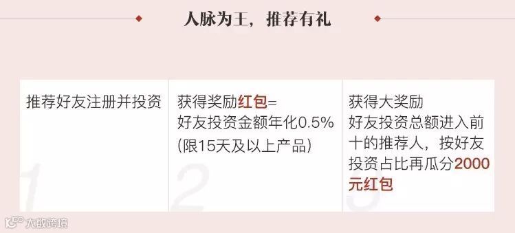 2. 活动期间内,被推荐人每完成一笔投资(限15天及以上产品),推荐人均可获得被推荐人年化0.5%的投资额红包奖励;