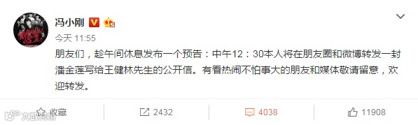 今天中午11点多,冯小刚首先发了一个预告,说要发一封给王健林的公开信。