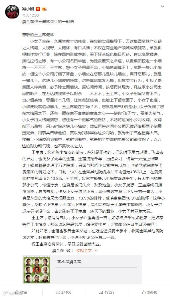 说12点30就12点30,冯导还真是准时啊!公开信来了!这封信以潘金莲视角,直斥万达铲除小墙皮,并放言“如您横扫千军如卷席,把奴家等同于小墙皮,那么请您除恶务尽,给俺零排片,让俺家金莲自生自灭去吧!”一片长信,用潘金莲口味写出,疑似为了电影《我不是潘金莲》的排片问题而撕逼。