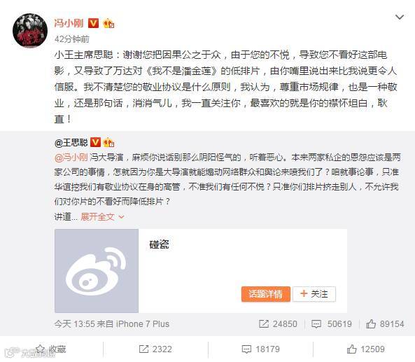 如此放话直击万达集团和自己的老爸,王思聪作为娱乐圈的纪检委,立马就坐不住了,放开我爸爸,让我开!13点55分,王思聪回应冯小刚:“说话别那么阴阳怪气的,听着恶心。”,“作为一个导演,用拿得出手的作品说话,岂不是更好?”并配了一个话题:碰瓷,也是蛮犀利。