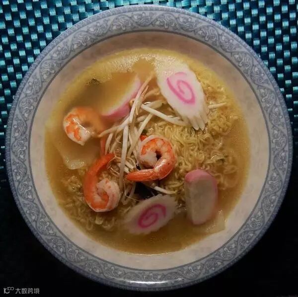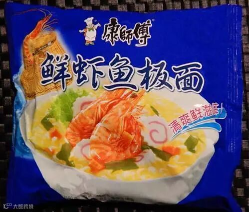 幸运的是,鱼类产品一般很容易进口,所以就有了这个品种。我们来看一下这种康师傅鲜虾鱼板面。