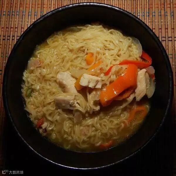 加入烧鸡、甜洋葱以及灯笼椒。面条不是很难嚼,很柔软。不是说那不好——这样的面真的很不错。喝汤的时候,面条很好地吸收了肉汤,稠度适中,而且有新鲜、可口的鸡肉香味。蔬菜和鸡肉很好,味道很不错。5分满分的话,可以给3.5分。