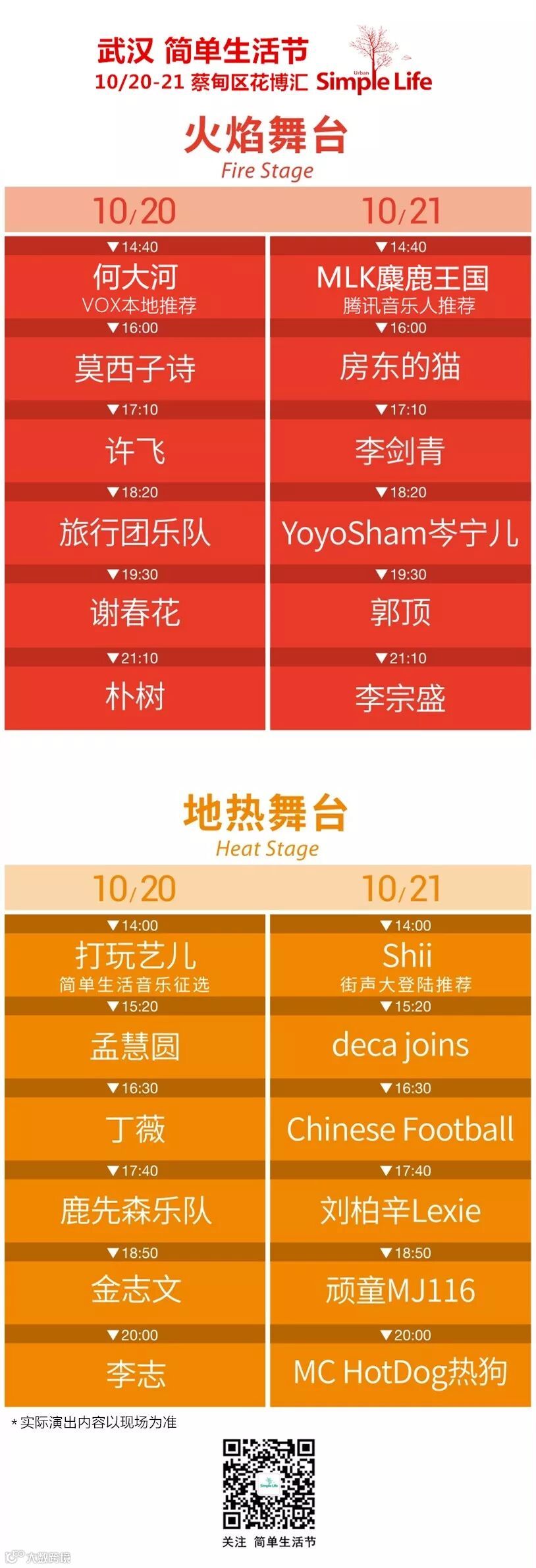 提醒:时间表上每组音乐人上方标注的时间为该组演出开始的时间,每组演出预计持续40-50分钟,具体以现场情况为准。