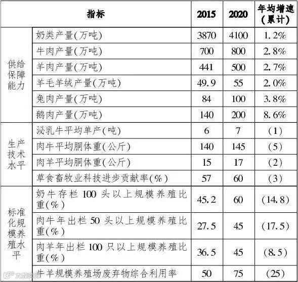 《规划》对新时期的草食畜牧业发展目标做了规定:到2020年,主要草食畜产品产能和质量水平稳定增长,市场供应基本保障;生产技术水平稳步提高,标准化规模养殖加快推进,生产效率、非粮饲料资源利用率和科技支撑能力进一步提升,初步构建现代草食畜牧业的生产体系、经营体系、产业体系。