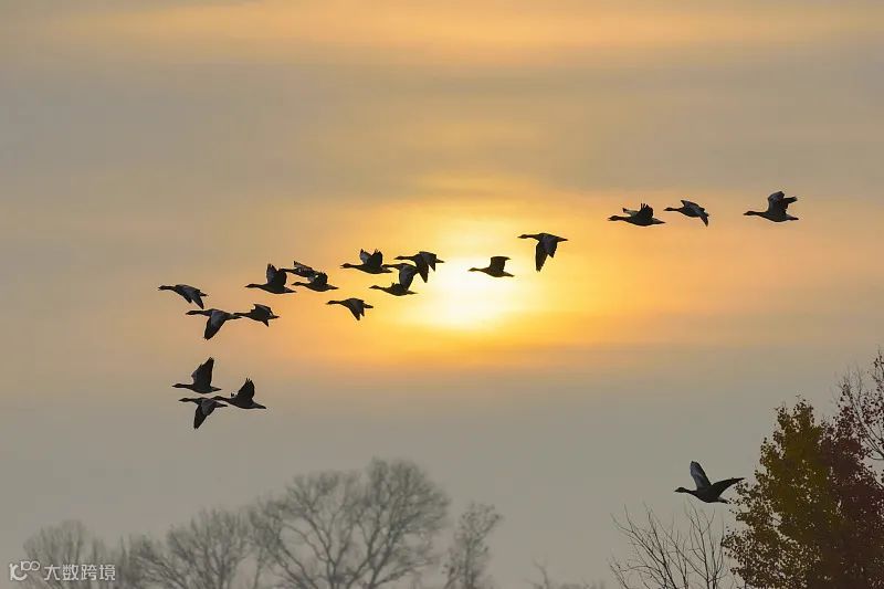 一候鸿雁来宾:鸿雁排成一字或人字形的队列大举南迁;此时是最后一批,古人称后至者为“宾”。