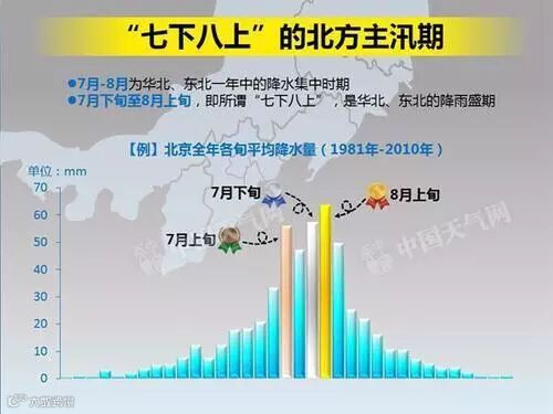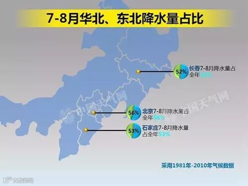 七月下旬至八月上旬,随着副热带高压的北移,冷暖空气在华北东北一带交汇,所以上述地区也在这段时间进入雨季。常年来看,7月下旬至8月上旬这段时间,是华北、东北一带降水最多的时间段,像北京、石家庄、长春等地,7-8月的降雨量最充沛,通常能占全年降水量的一半以上。