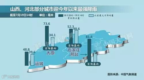 昨天,华北、黄淮遭遇今年以来最强的一次降水过程,普遍有暴雨出现。监测数据显示,山西东部、河北南部、山东西部、河南北部的很多站点都出现了100毫米以上的大暴雨。其中华北最强降水出现在河北武安,24小时降水量406毫米。省会级城市中,河北石家庄降水228.6毫米。