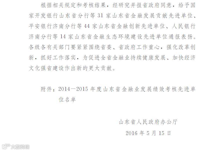 近日,从山东省人民政府办公厅传来喜讯,普惠农牧融资担保有限公司在山东省人民政府对2014-2015年度全省金融业发展绩效考核中,荣获“山东省金融创新先进单位”荣誉称号。这是普惠扎根农业和锐意创新的结果,也是政府肯定、客户认可、社会各界支持的体现。