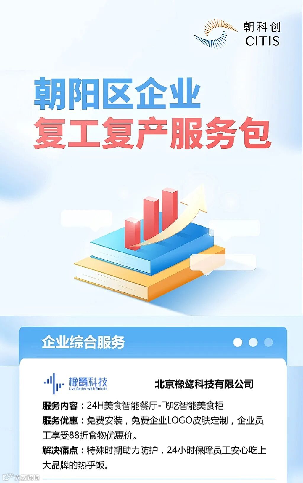 橡鹭科技旗下智能美食柜飞吃凭借能帮助企业员工24小时吃上“热乎饭”的商业创意和服务优势,成功入选此次朝阳区复工复产服务商。