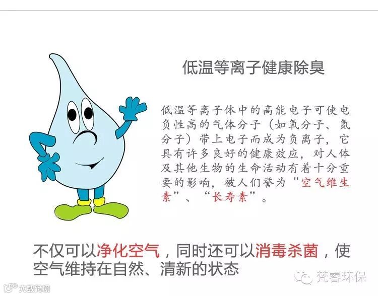 低温等离子体中的高能电子可使电负性高的气体分子(如氧分子、氮分子)带上电子而成为负离子,它具有许多良好的健康效应,对人体及其他生物的生命活动有着十分重要的影响,被人们誉为“空气维生素”、“长寿素”。
