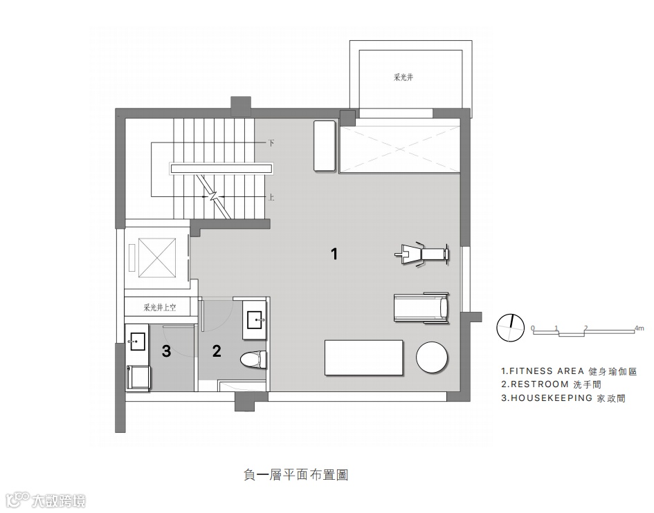 负一层是家庭健身康体空间及家政区域,通过局部挑空的空间手法,达到更好的采光及空气对流效果。镜面与灯光的运用,丰富了空间的层次感。