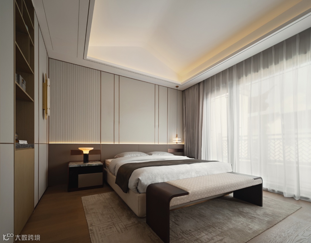 长辈房用沉稳的设计语言及配色打造,呈现简约舒适的家居氛围。灯光与窗外阳光的投射,使柔和的光线在房间中流淌。精巧且艺术的陈设软装,让空间彰显艺术涵养和生活意趣。