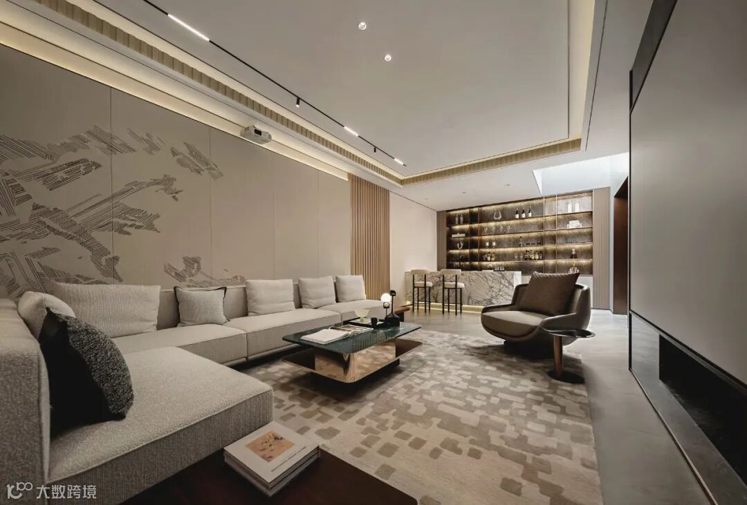 自然光从一侧照进负二层的影视厅,一幅现代山水画映入眼帘,提炼“山”元素进行创作,在传统的基础上进行必要的演化和抽象化,营造平和含蓄的东方意韵。传统美学与现代语汇的碰撞中,感受亘古不变对于精神自由的向往。室内以现代的手法,呈现矜贵非凡、品位盎然的生活体验。