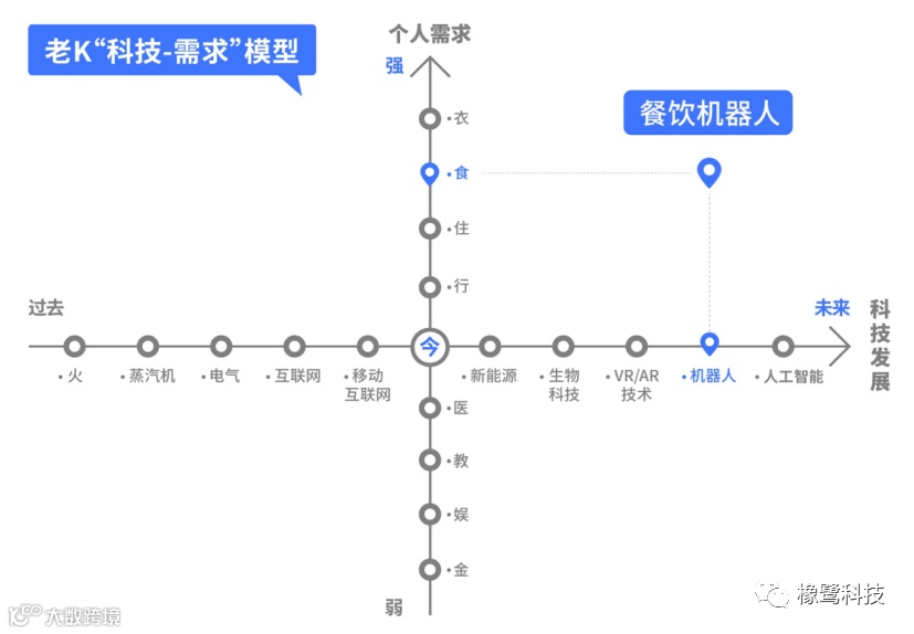 在老K看来,一些TOP级的互联网公司成为世界级企业,正是踏中了坐标系左上象限“互联网”(包括移动互联网)与“食”、“行”等构成的天时区间,而橡鹭科技踏中的,则是坐标系右上象限的“机器人”与“食”构成的这个天时区间。