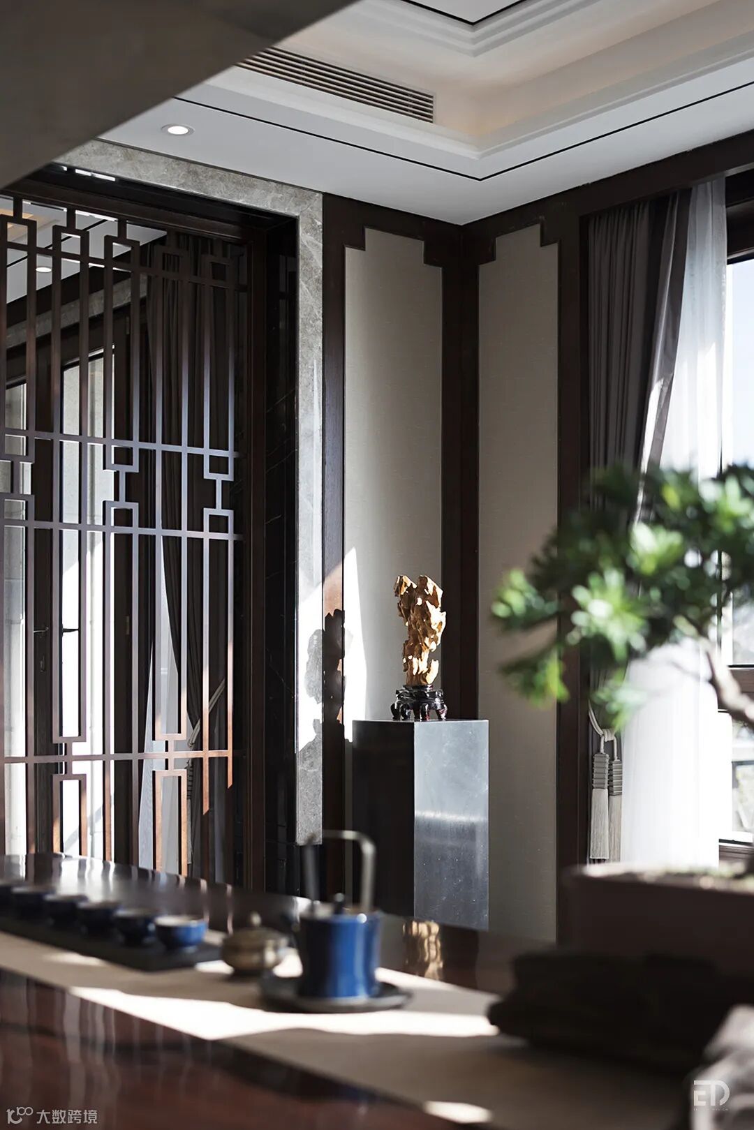 品茶区与客厅一脉相承,营造出闲适典雅的空间氛围。设计师将中式的禅风意蕴,以其缓缓流淌的文化气质渗透进现代生活的点滴之中。