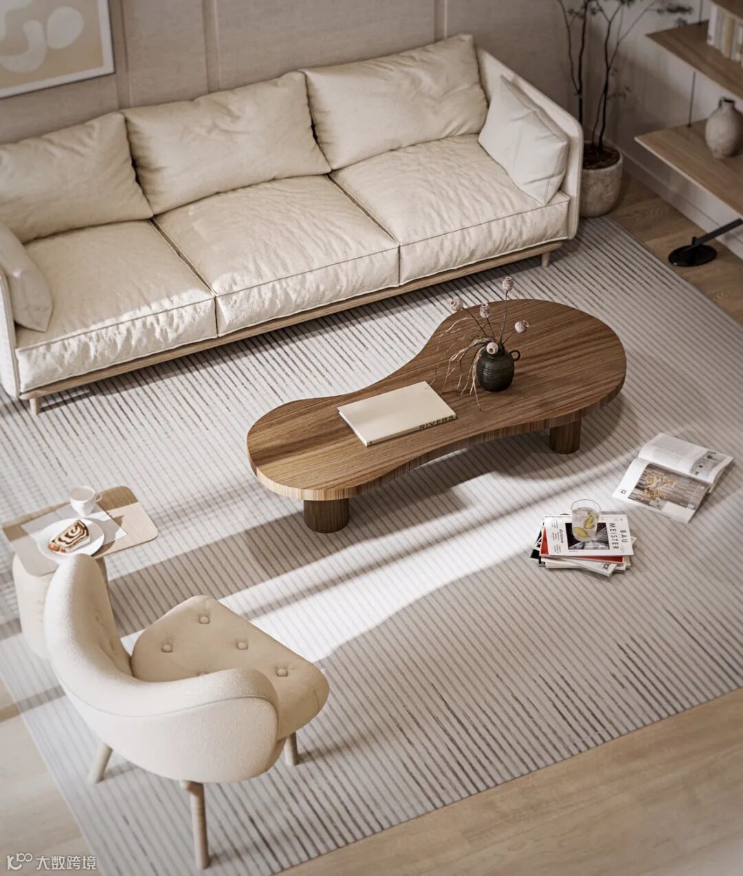 来自丹麦&Tradition品牌的Wulff Lounge Chair休闲椅,有机的雕塑感外形与羊毛、编织面料的组合,无一不透露着巨大的吸引力,印证了“丹麦设计”的黄金年代。书架、三位沙发及长凳来自星创家具-Stellar works。落地灯来自雕塑家野口勇的经典设计。