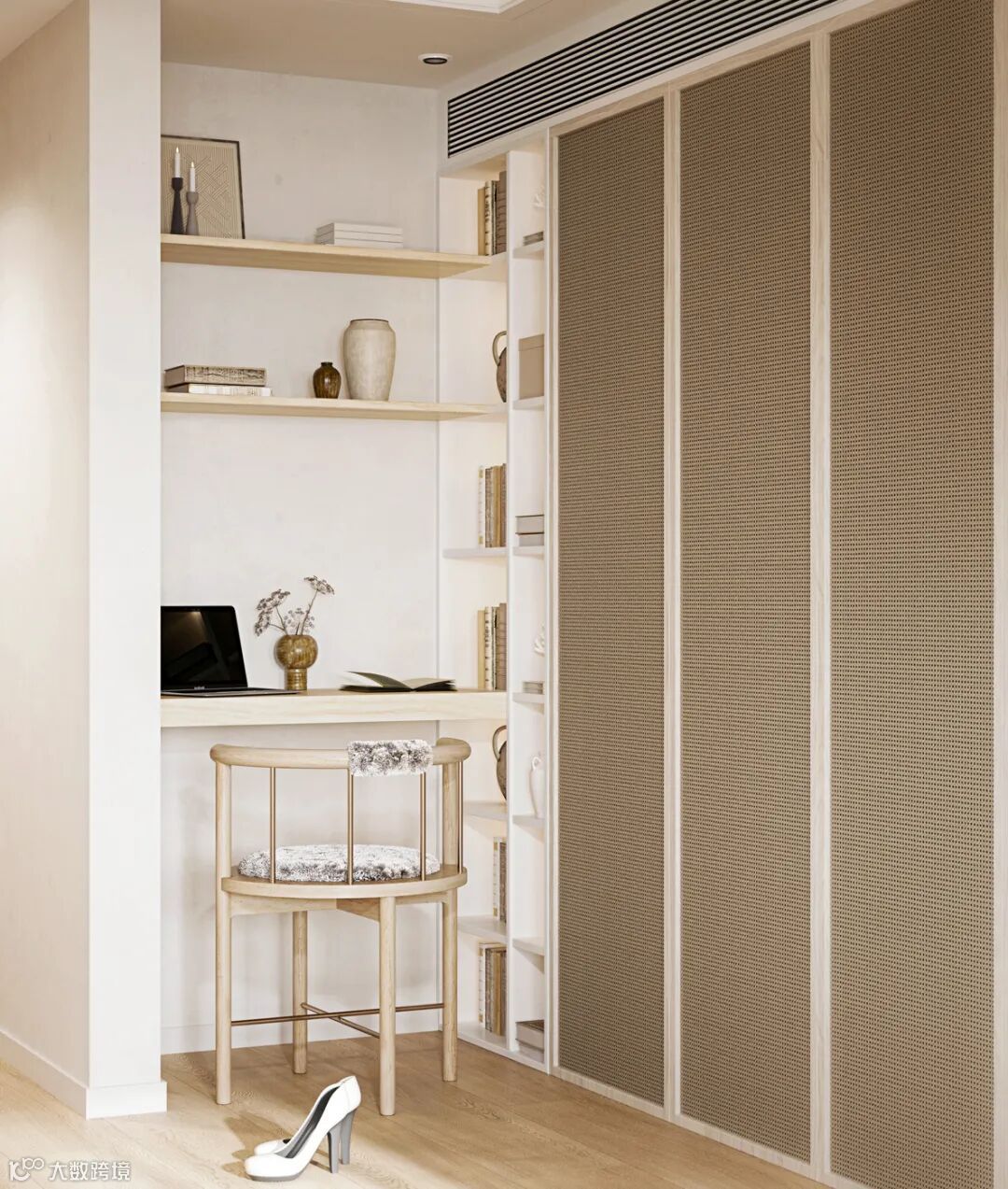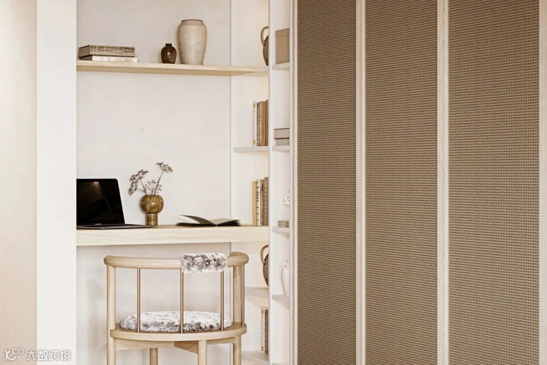 在室内一角,设计师结合收纳柜设计了开放层架及工作台面。层架上陈列着主人从世界各地收罗的摆件和平时喜欢看的书籍。小桌面可以在家里处理一些工作,也可以作为学习的空间。