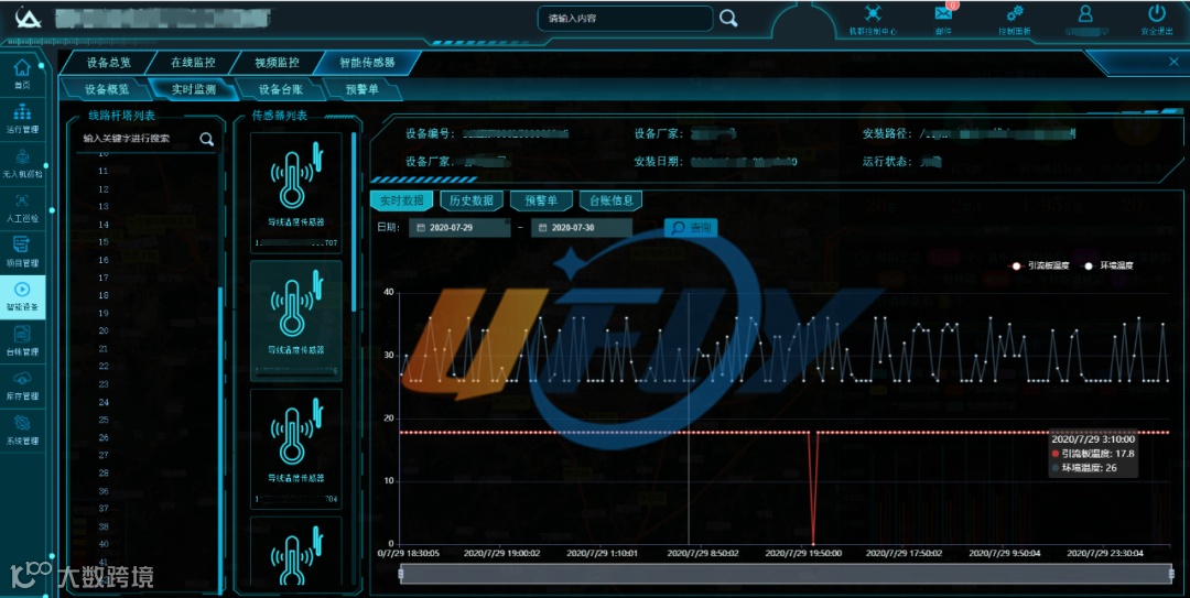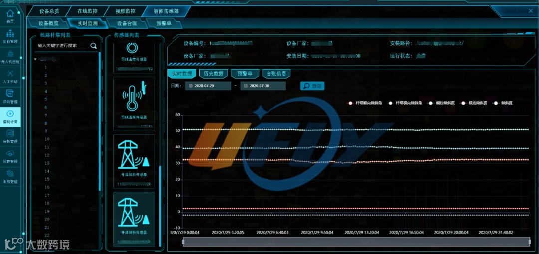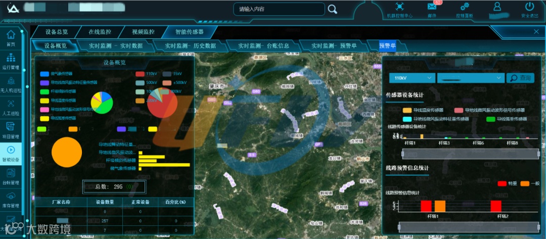 智能传感器接入,基于物联网技术,在杆塔上安装各类智能传感器,通过统一接入协议,将传感器实时监测数据接入,从多角度实时监控杆塔设备上的智能传感器,异常信息实时预警。
