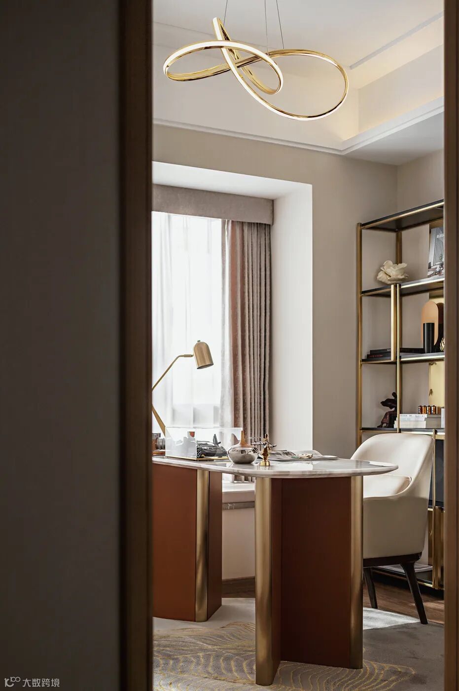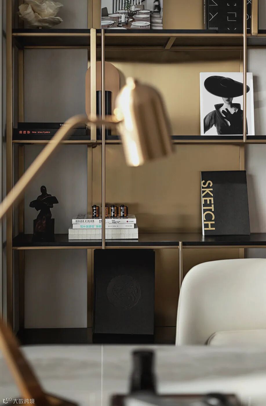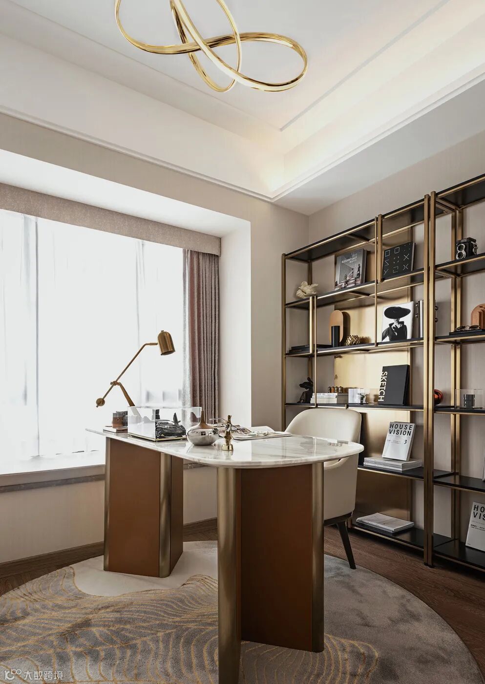 黑白与金属的拼接,多重质感的组合,构筑了书房精致的空间格调。金属隔断赋予书柜更强的层次感,各式各样的摆件体现出主人的独特爱好。书房在简约与优雅中尽显奢华,为主人打造了一个幽静的精神栖息之地。