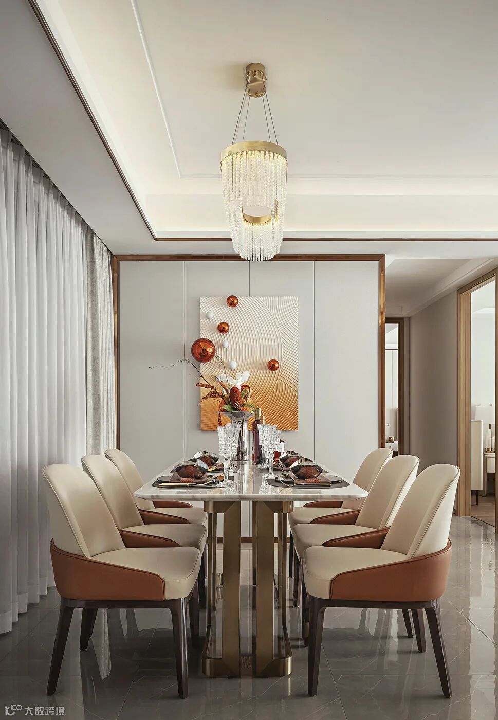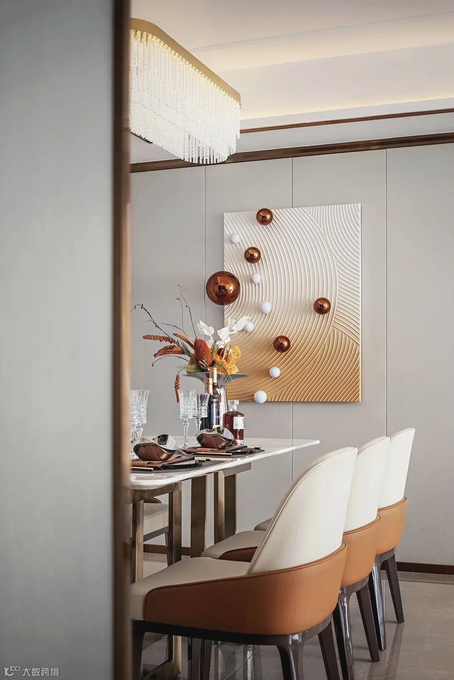 客餐厅地面采用了清爽而大气的浅灰色地砖,墙面采用米白色皮革硬包,金属线条作为墙面的镶边,线条的美感让空间的质感变得更为立体。水晶吊灯与金属镶边相辅相成,奢华的气息在空间中静静地流淌。