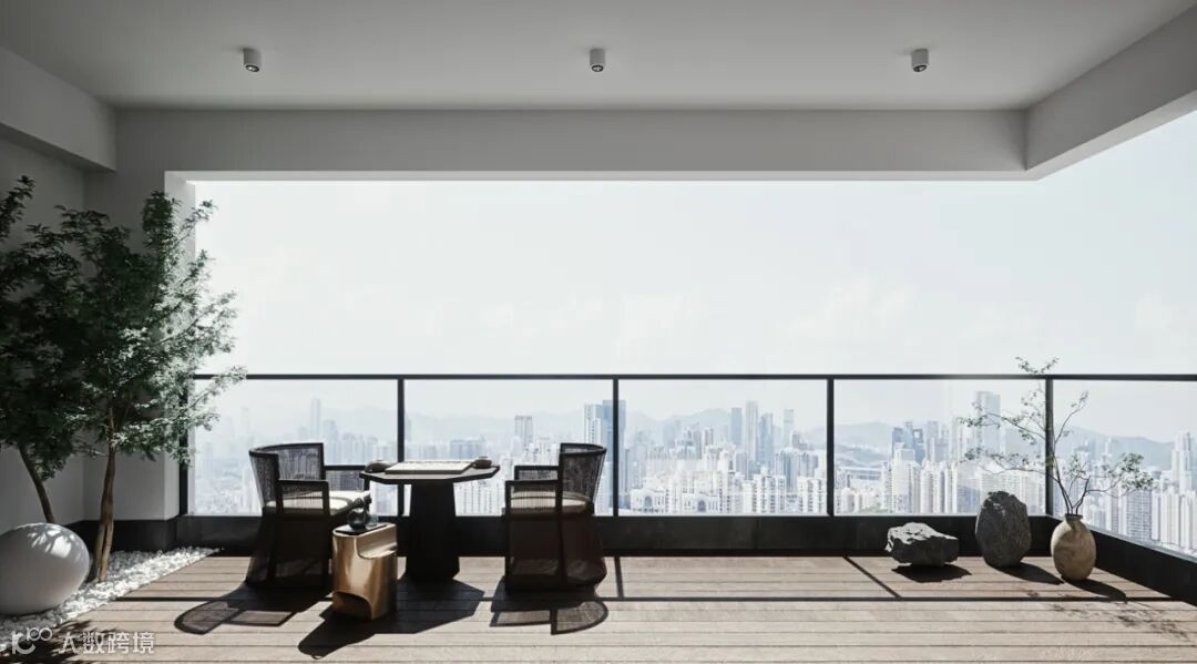 景观阳台和生活阳台分工明确,前者供闲坐观景,后者供晾晒衣物。相应的,景观阳台的视野更为开阔,城市的繁华风景得以尽收眼底。