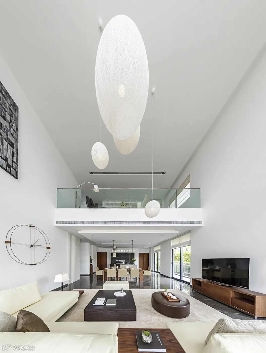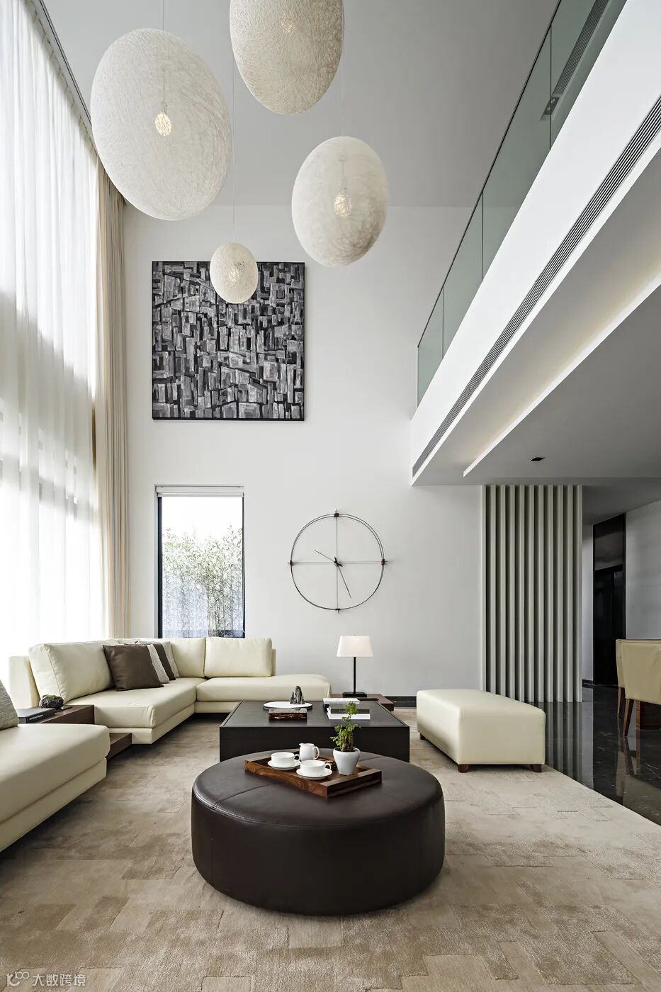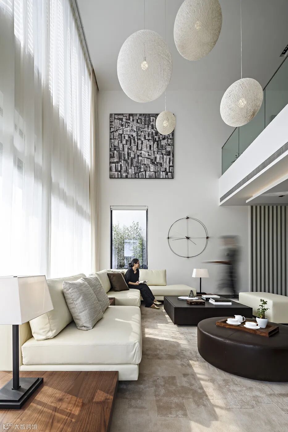 米色麻质球形灯饰错落有致的悬于客厅中空,精致淡雅的米色皮质沙发,方圆各一的深啡色茶几,肌理有别却又彼此呼应,从空间到家具的深浅搭配,光线从挑高的落地窗倾洒进屋,映衬着咖色细密纹理的胡桃木的自然,透出禅意东方的人文气息与洗尽铅华的洒脱。