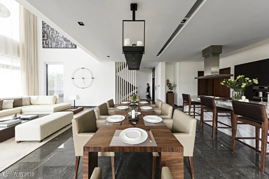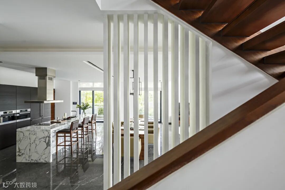 戴勇设计团队在进行陈设设计时建议业主将一层及负一层地面原有的米黄石更换成格力士灰云石,深灰色的地面与净白色的墙面形成鲜明的对比,并将原交付标准的西厨岛台更换成雪花白云石,增强材料的质感变化。
