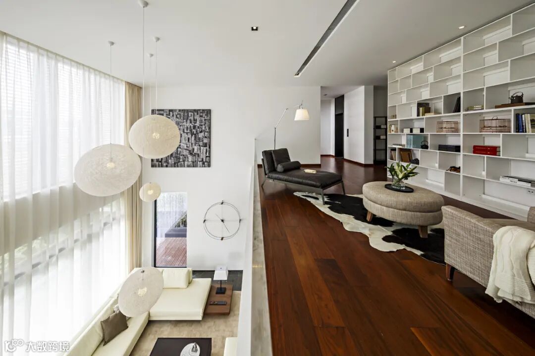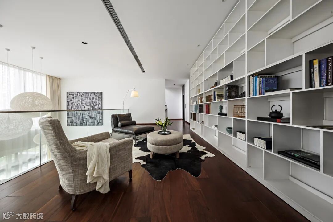 信步而上,二层楼梯间一整面白橡木书架辟出一隅静心阅读之所,依旧是布艺与皮质结合的现代极简风格的家具,整个空间布局流畅自然。细细品味,方能读懂简约之家的每一处的极致与揣摩,感受到每一丝匠心独运的微妙。