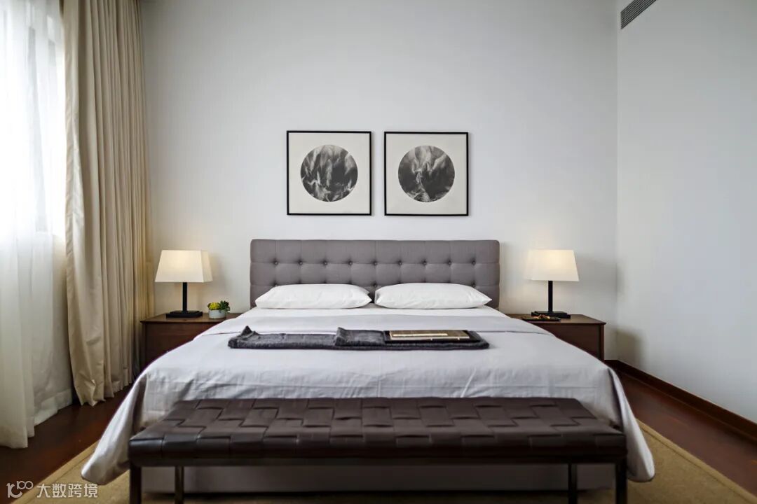 主人房呈现简洁沉稳的格调,米色的皮革和天然胡桃木材质适合家庭舒适、温馨的情感需求。