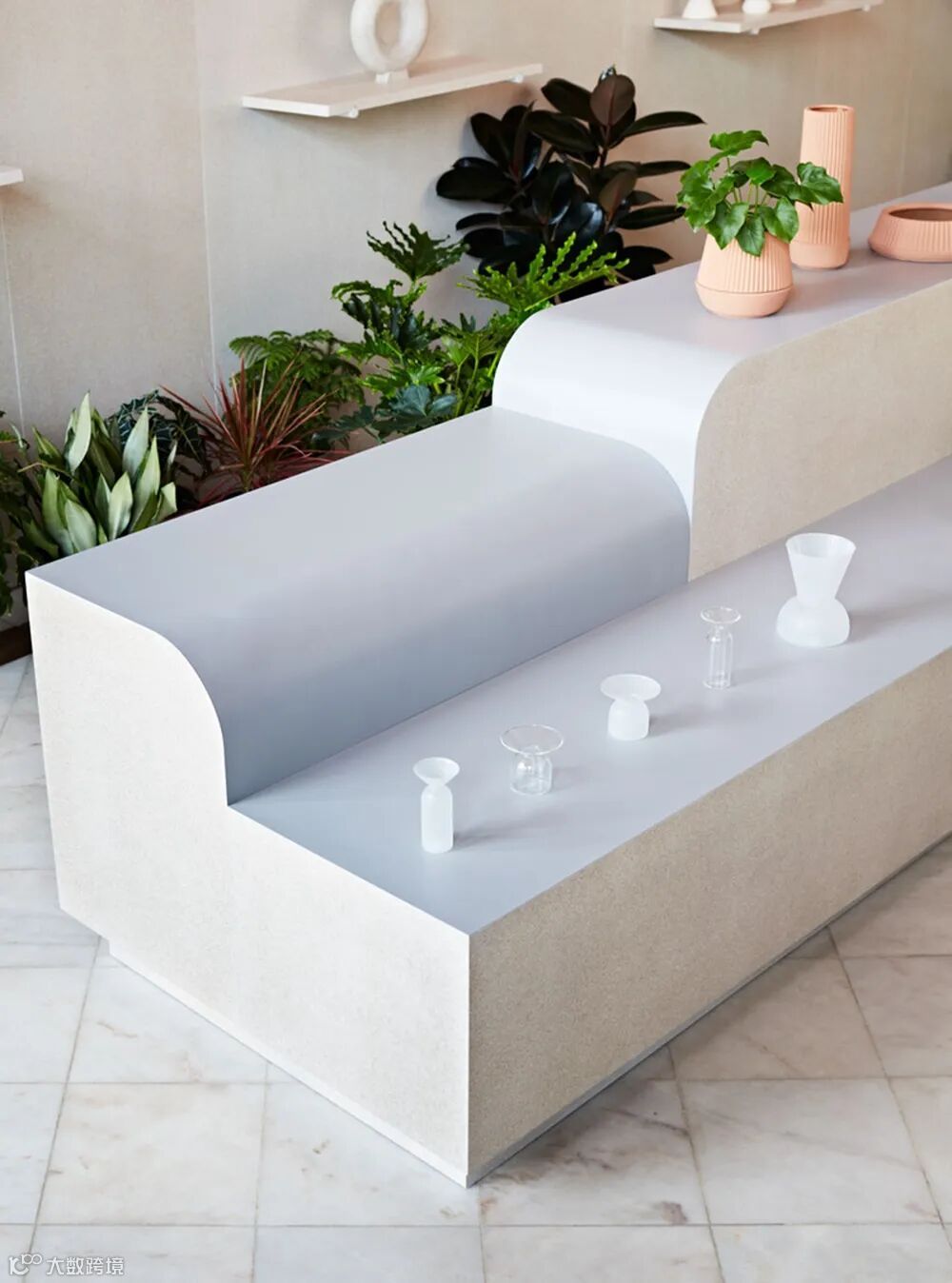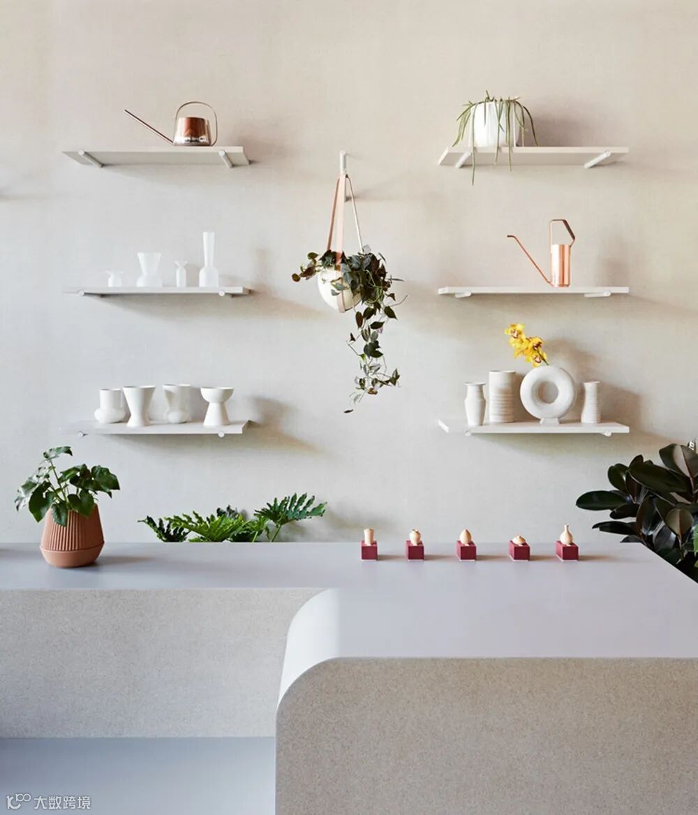 “出于预算上的原因,我们决定使用较便宜的材料,但它们也很好地商店的气质融合。”MSDS的设计师Jessica Nakanishi说。白色展台向下弯曲形成弧度,创造了一个有机的多层次的植物展示平台。“它对植物十分实用,因为它是防水的。刨花板提供了一个中性色调的背景,但越走近你会越对它感兴趣。这种建筑基础材料经过酸洗以吸收牛奶中的污渍,然后用砂纸打磨并染色多次,才达到了一种“神秘”的效果”Fraser 描述说。