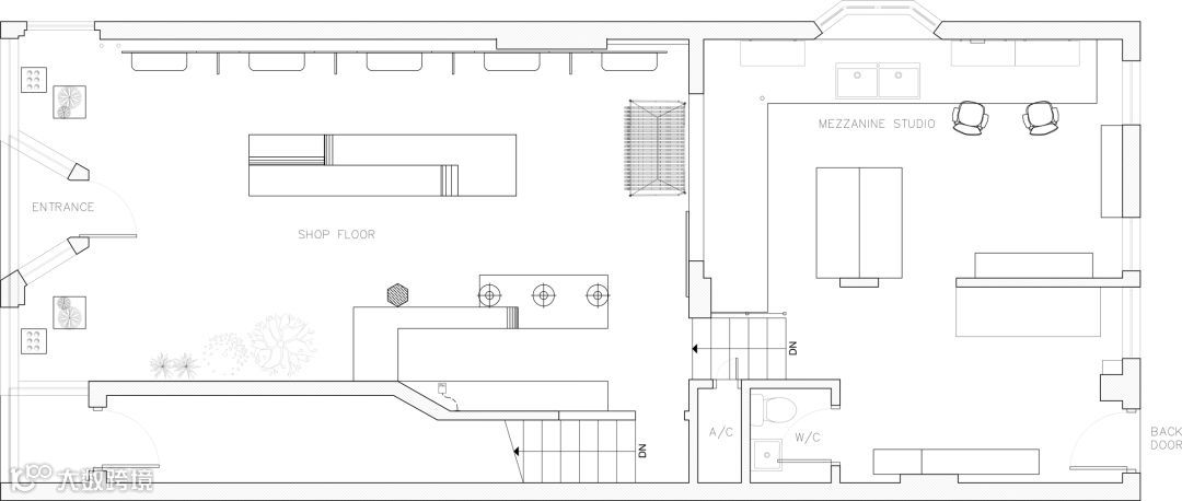 在这个空间的后面,一组台阶通向花店的工作室,里面有一张长长的办公桌、两把工作椅和一个卫生间。