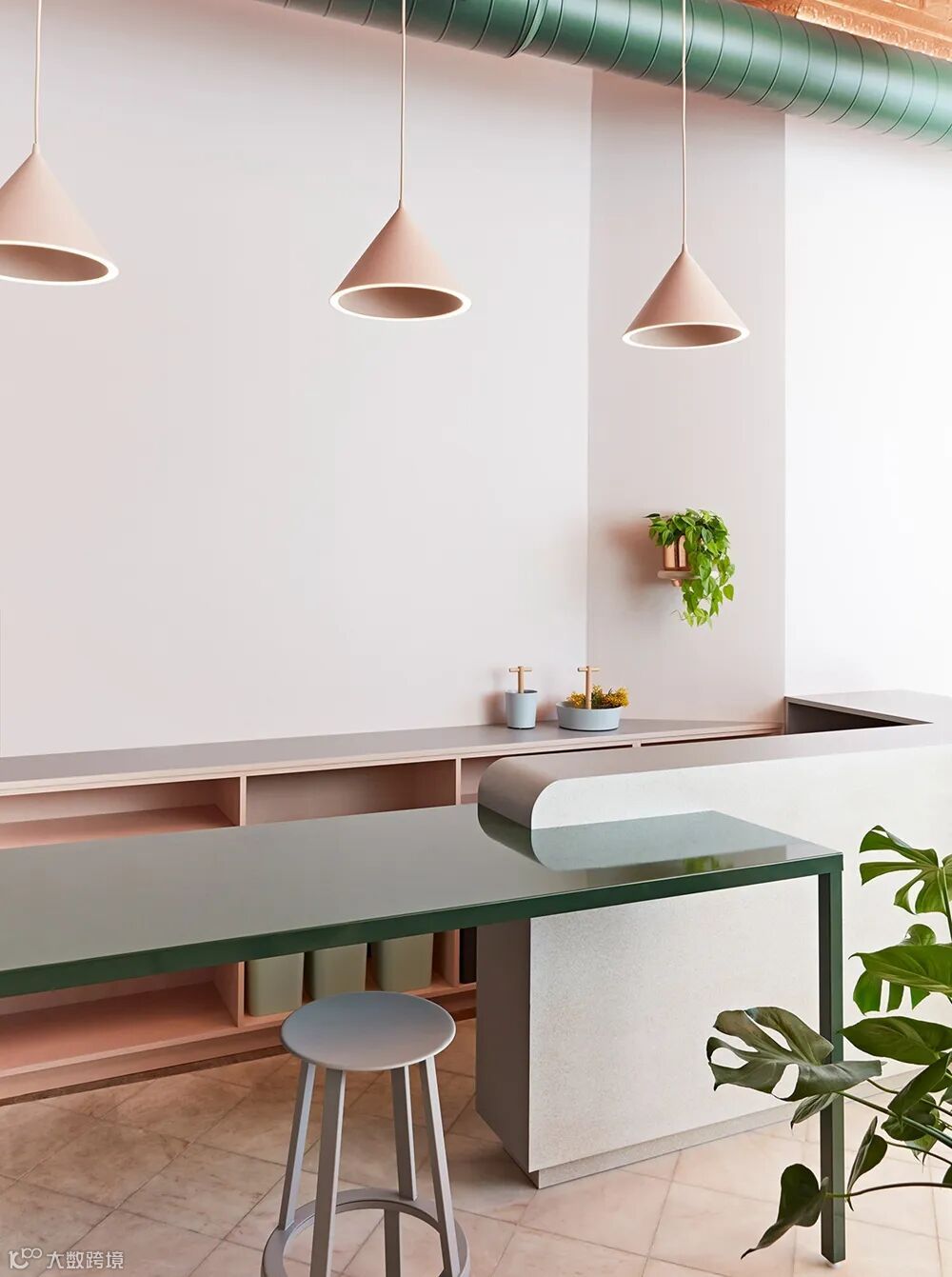 石地板没有被改变。Nakanishi的合伙人Jonathan Sabine表示:“我们基本上必须在这个空间里建立一个空间。”中性灰色、柔和的粉色和工业风管道上的绿色被用来补充和软化建筑的特点。一对来自Anony的灯管在视觉上延展了空间。