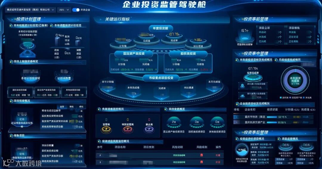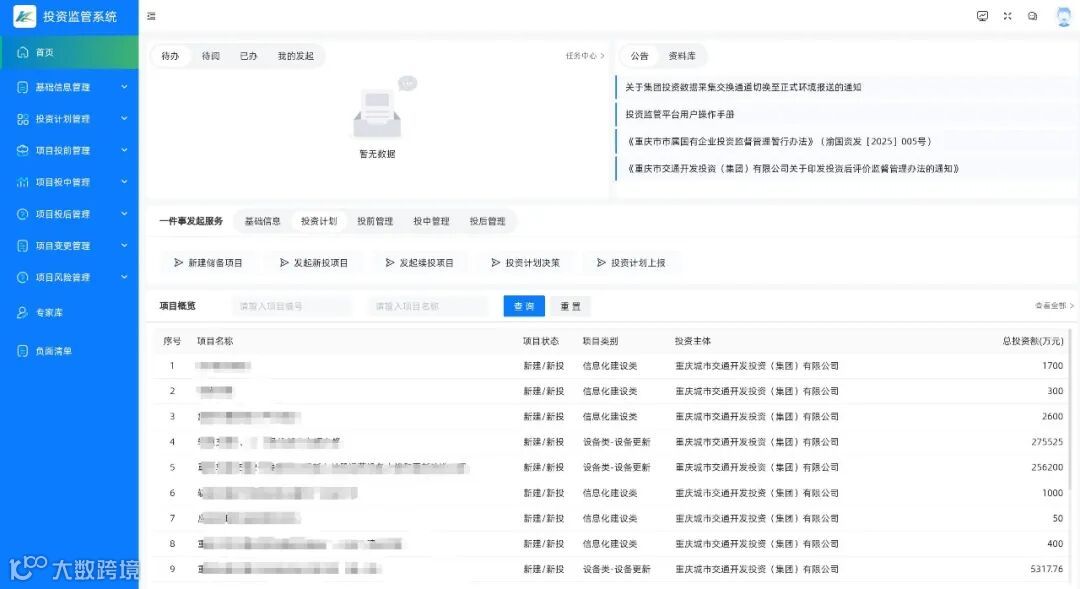 集团全级次投资监督管理系统正式投运后,聚焦“数据来源、功能应用、多跨融合”三大核心维度,基本实现集团内部投资管理“纵向贯通、横向联动”;同时,与市国资委建立全量、实时、常态化的数据报送机制,逐步向“投资决策科学化、风险管控精准化、资源配置高效化”的最终目标迈进。