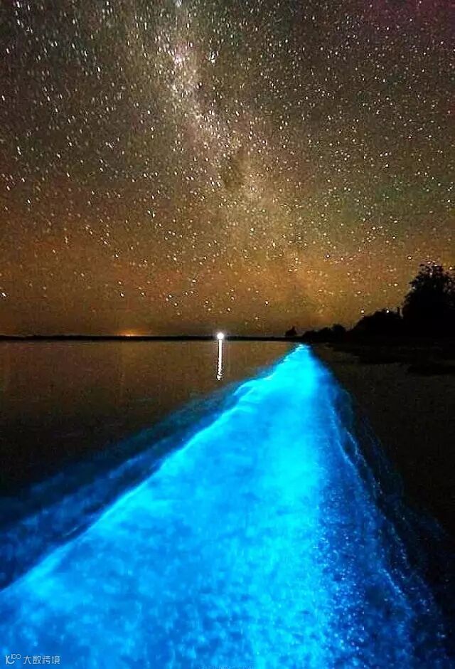 在马尔代夫的海边,无数散发着幽蓝色光芒的浮游生物随着浪花冲在沙滩上形成了“荧光海滩”。荧光海是一种生物发光现象,生物通过体内的一定化学反应,将化学能转化为光能而释放的过程。