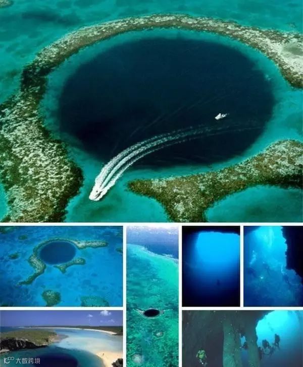 大蓝洞,伯利兹。这些巨大的水底洞穴形成于遥远的冰河时代,当时的海平面与今天完全不同,许多海底还都暴露在地表。蓝洞可能是当时的侵蚀形成的,然后又被海水灌满。