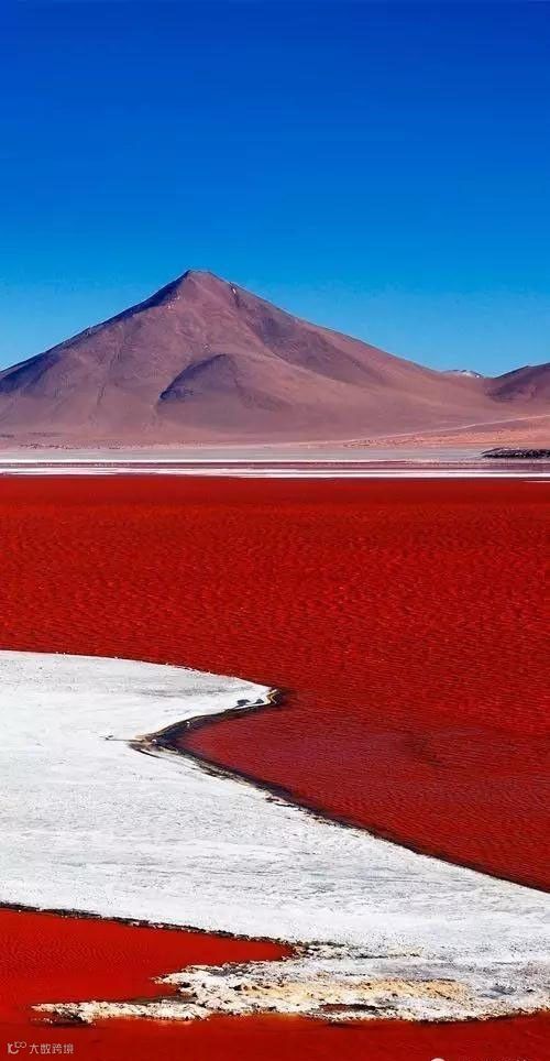 62 科罗拉达湖是在玻利维亚的一座盐湖,它的红色是由藻类的色素形成的。