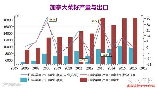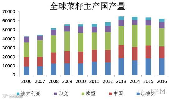从进口国别来看,2015年中国有将近90%的菜籽是从加拿大进口,澳大利亚也有一小部分。放眼全球,根本没有几个国家有货可以出口的。几个主产国中欧盟自己还要进口大约350万吨,中国也需要进口,大约380万吨,印度只能自给自足。只有加拿大和澳大利亚还有点余粮可以出售。恰恰不巧的是,2014/15年度加拿大菜籽大幅减产11%,出口没有增量,之后两年的产量也只是恢复到13/14年水平,并没有增长。
