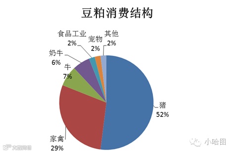 首先我们看看豆粕和菜粕的主要用途。豆粕是棉粕、花生粕、菜粕等12种油粕饲料产品中产量最大、用途最广的一种。作为一种高蛋白质原料,豆粕主要被用作猪、牛与家禽饲料的原料,大约占到豆粕用量的94%,其中猪饲料占到一半以上大约52%。菜籽粕也主要作为饲料原料用于养殖行业,但菜籽粕在加工过程中会产生一些对动物有毒的物质,在动物饲料中的添加比例必须严格限制,一般幼雏应避免使用菜籽粕,肉鸡用量在10%以下,蛋鸡、种鸡在8%左右,鸭饲料中菜籽粕用量一般在10-15%,猪5%以下,母猪应控制在3%以下。菜粕一半以上都用作水产饲料。