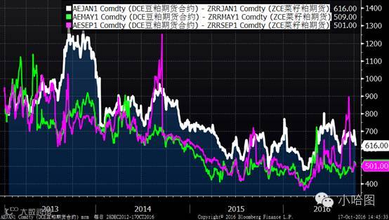 豆粕与菜粕1月、5月、9月期货合约价差