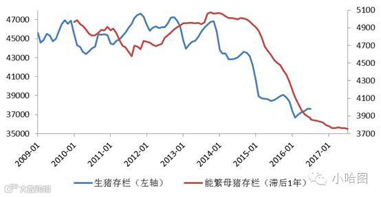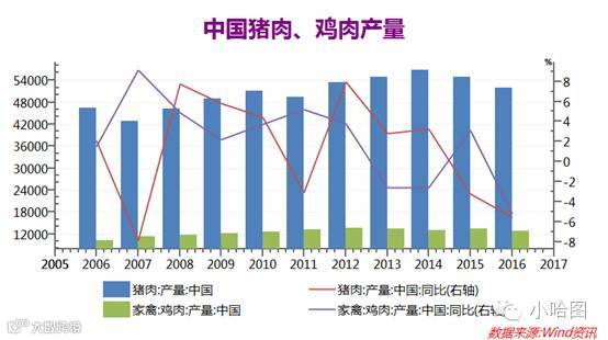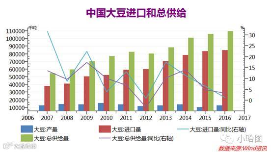 作为豆粕消费的主力生猪养殖业近些年受行业整合,环保政策等多重因素影响存栏量不断减少,数据显示从14年开始我国能繁母猪和生猪存栏开始进入下降通道,猪肉产量连续两年下滑;另外从13年开始鸡肉产量也开始下降,13年到16年4年平均增速大约-2%。下游养殖业存栏下降意味着对豆粕需求的减少。