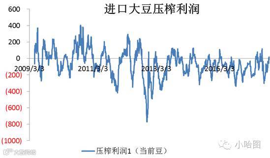 相比较之下进口大豆压榨利润逐年走低,最近两三年基本在0值以下波动,豆粕供给过剩在这里可见一斑。这里我们核算的是现货时时压榨利润,鉴于企业的销售策略不会完全安照每个时点的现货价格卖豆粕和豆油,核算的结果与企业实际情况会有一定出入,但在相同条件下横相比较还是有一定的参考意义。