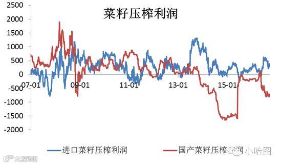 事实好像并非如此。从2013年中开始我国产菜籽价格持续高企,进口菜籽成本却逐步下降,进口菜籽优势越来越大,在2015年4,5月份国内菜籽上市前进口利润最高达1900元/吨。同时进口菜籽压榨利润一直较好,高点可以达1000元/吨以上,平均情况下大约300-400元/吨。相比之下,国产菜籽压榨利润从13年底开始就进入负值以下,没有进口货源的企业生存困难。