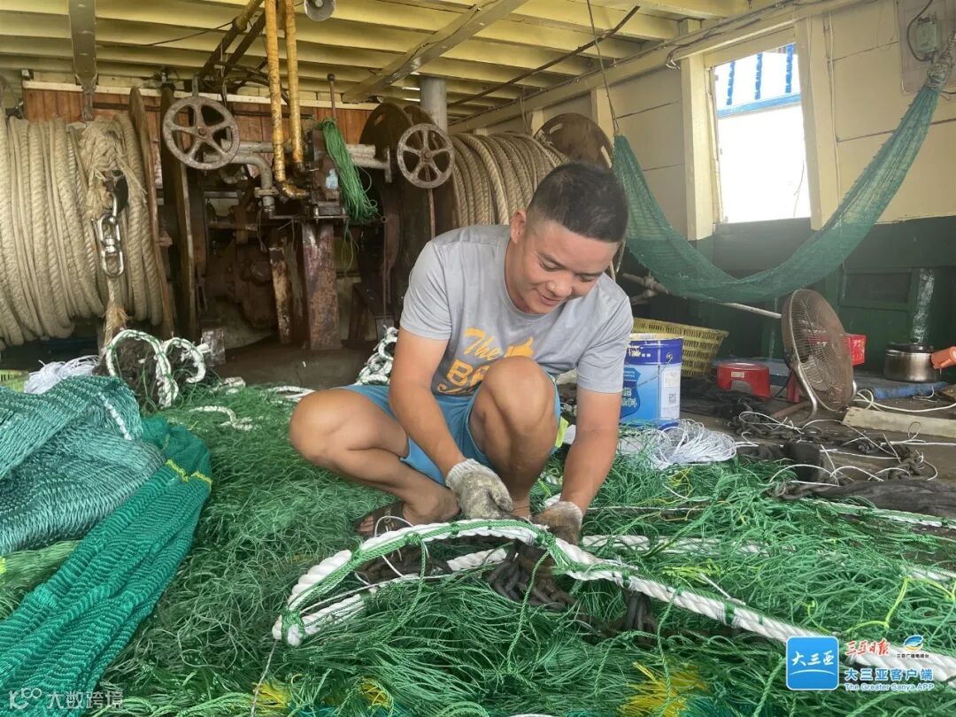 一艘临高渔船上,渔民黄勇正忙着修补渔网,他皮肤黝黑、眼神坚毅,常年捕捞作业,海上的阳光和风浪在他脸上留下了痕迹。开渔日益临近,黄勇心中的期待也越发强烈,这几天,他几乎全天都待在港口,和工人们一起检查出海设备。为了顺利出海打鱼,几天前黄勇就回到渔船上,完成了清洗甲板、修理船机等工作,还修补好了几张渔网。
