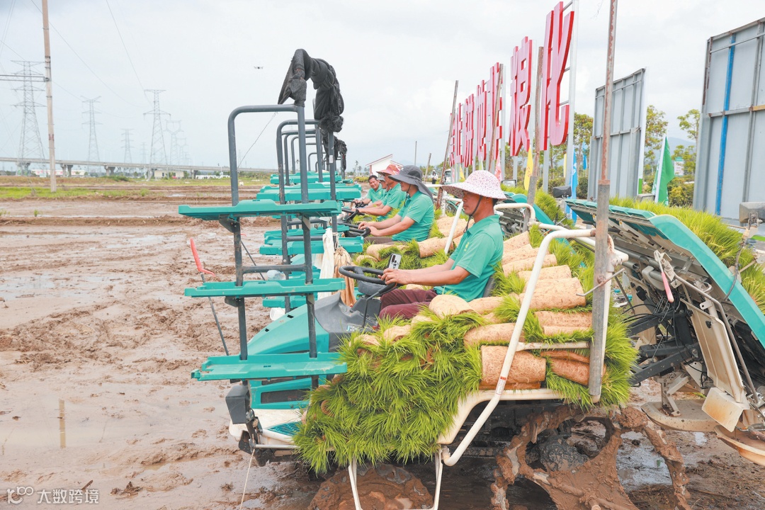 崖州区坝头南繁公共试验基地,5台插秧机一字排开,蓄势待发。