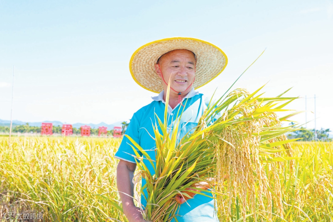 在崖州区坝头南繁公共试验基地,收割者手捧饱满的稻穗,脸上满是丰收的喜悦。
