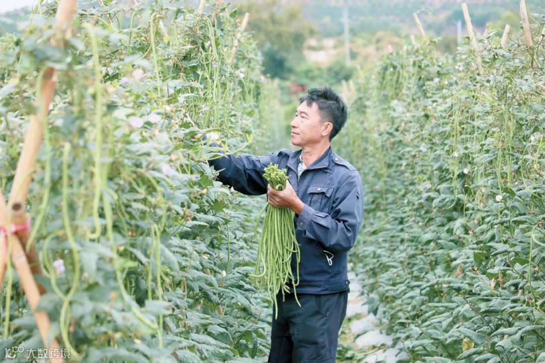 在崖州区拱北村的田洋上,村民黄德标在采摘成熟的豇豆。