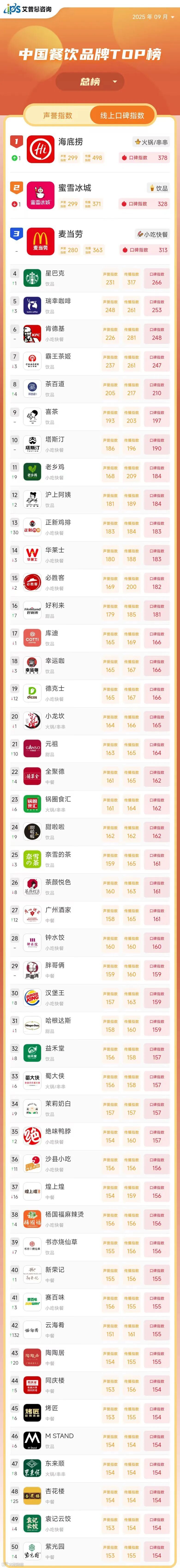 线上口碑指数排名前50的餐饮品牌中,包括火锅/串串品牌6个、小吃/快餐品牌14个、甜品品牌3个、中餐品牌11个、饮品品牌16个、西餐品牌0个。