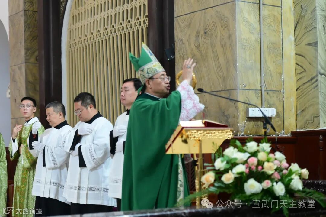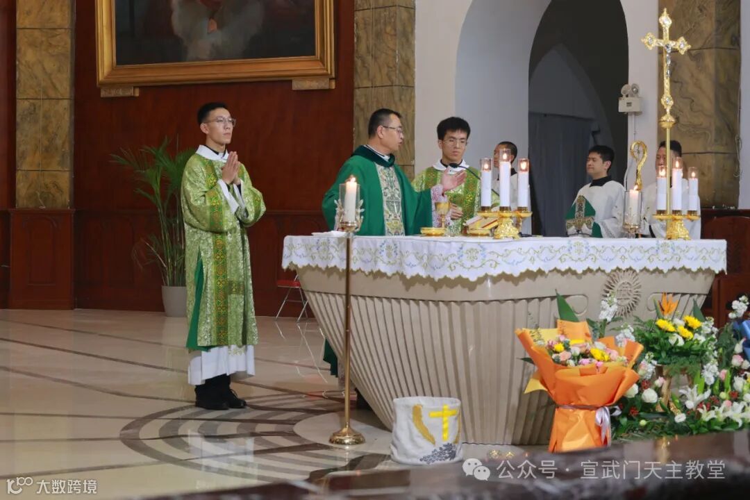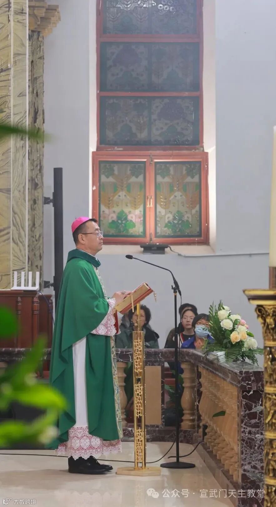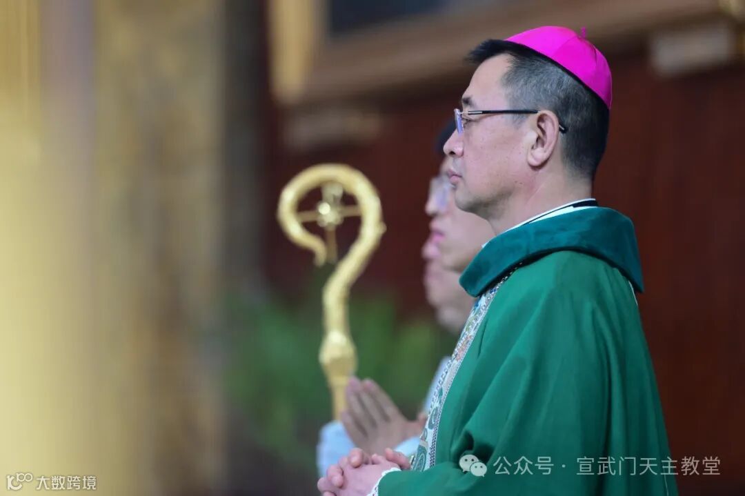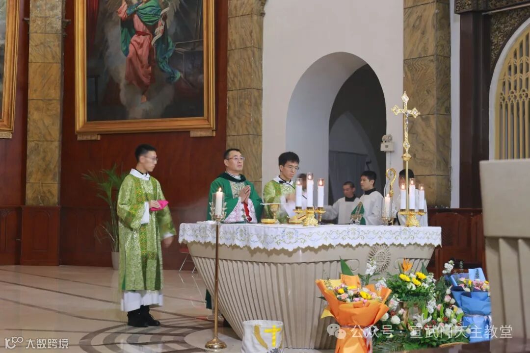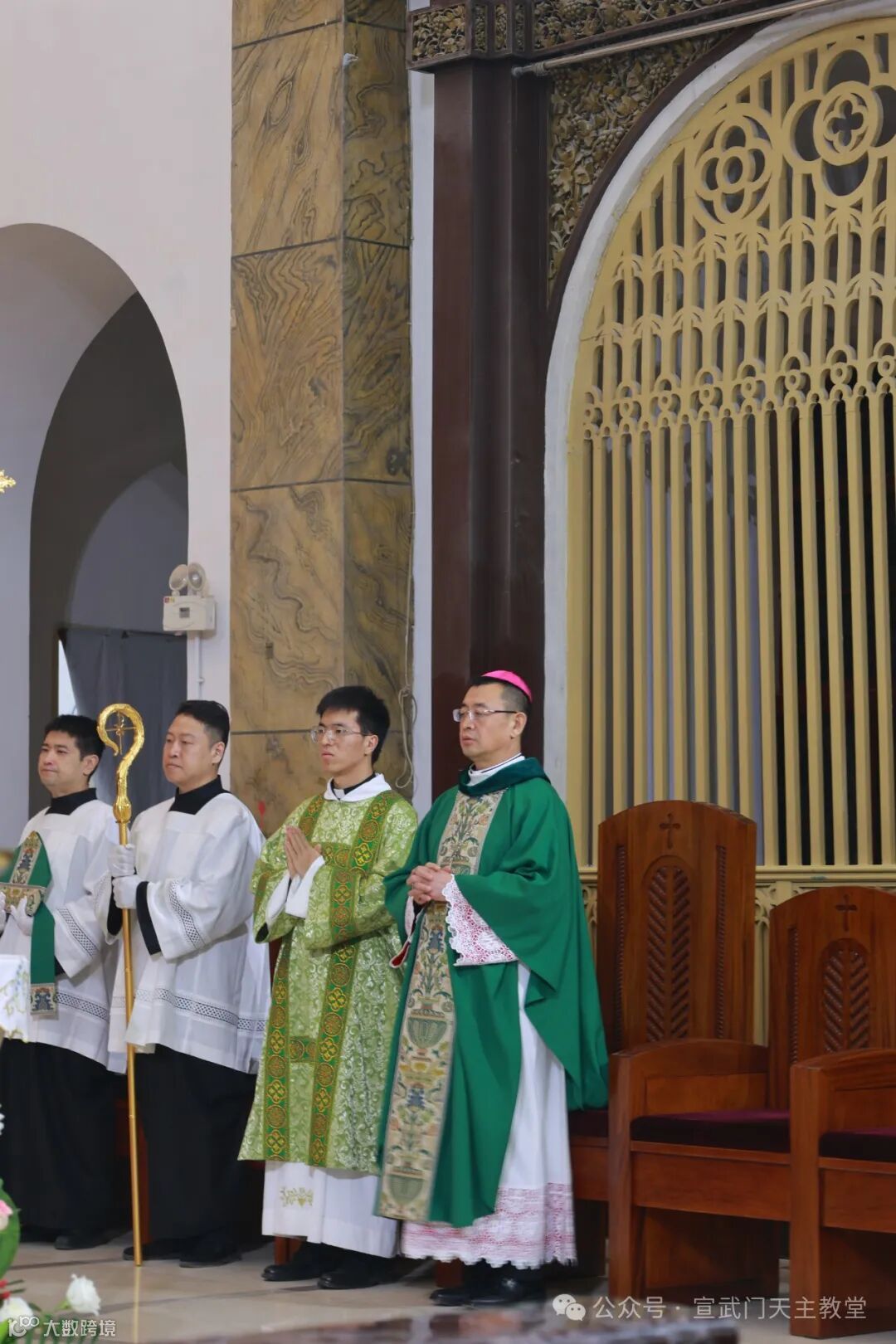 伴随着悠扬的钟声,甄雪斌主教身着深绿色的主教服,神情庄重而肃穆,手持权杖,缓缓步入圣堂,开始了他的首祭弥撒。