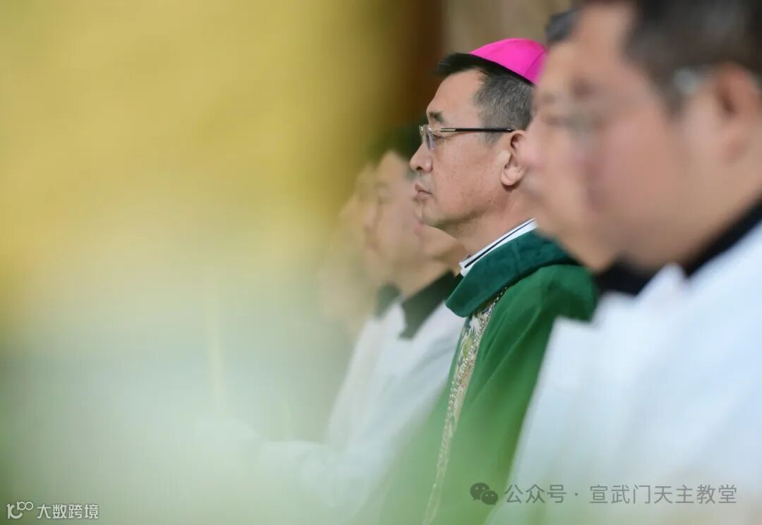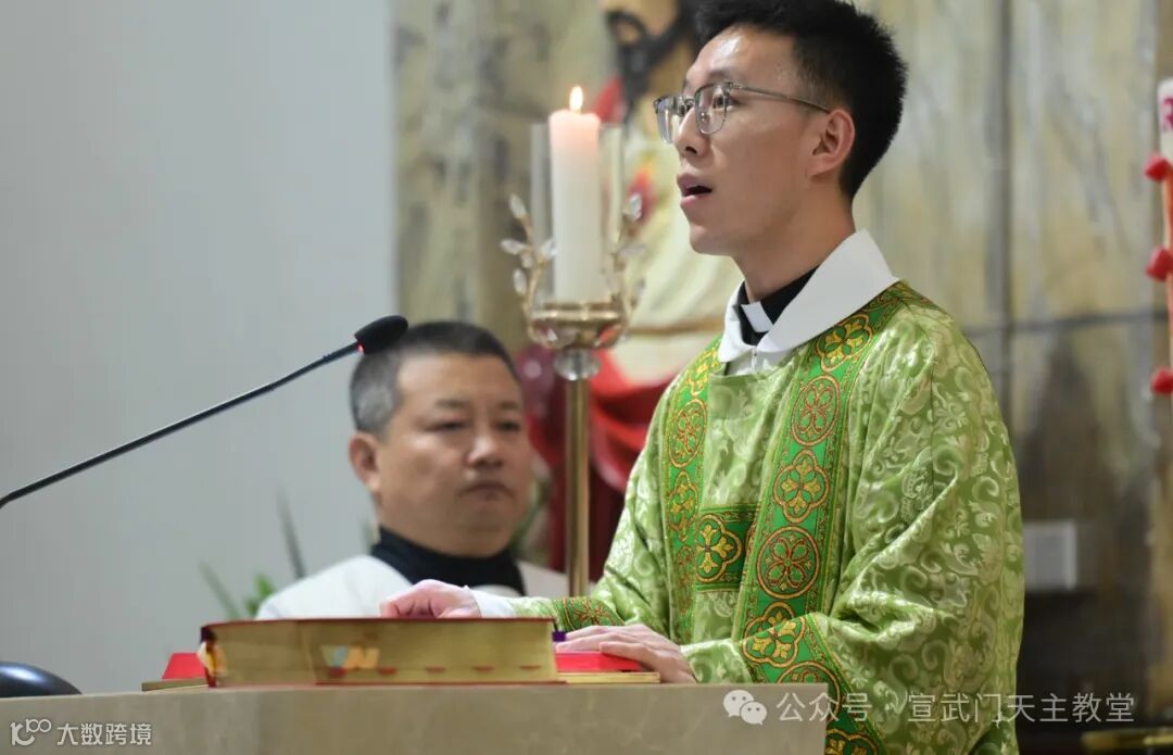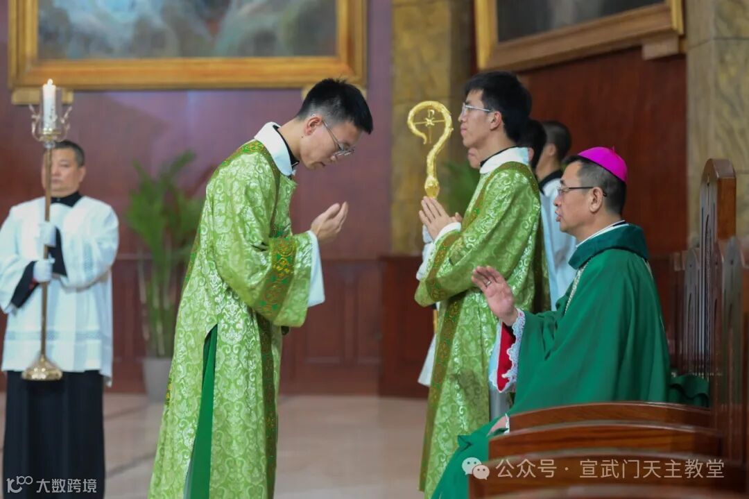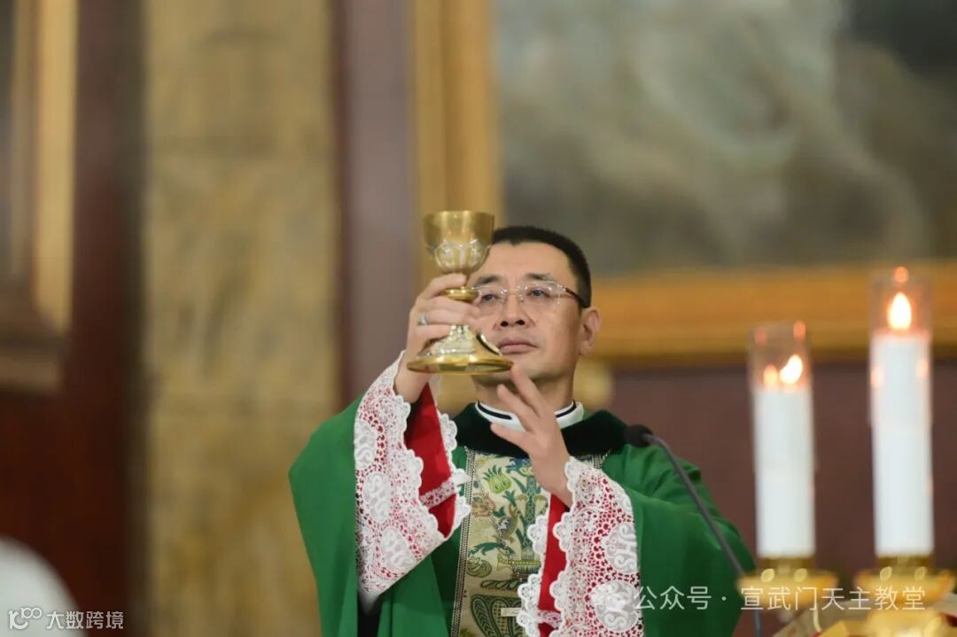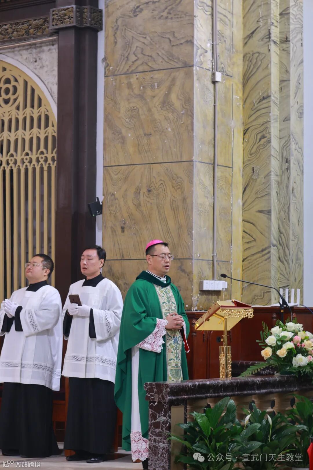 伴随着悠扬的钟声,甄雪斌主教身着深绿色的主教服,神情庄重而肃穆,手持权杖,缓缓步入圣堂,开始了他的首祭弥撒。